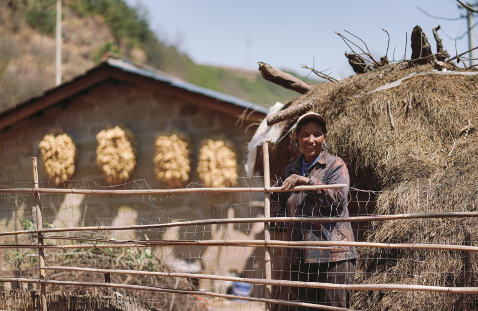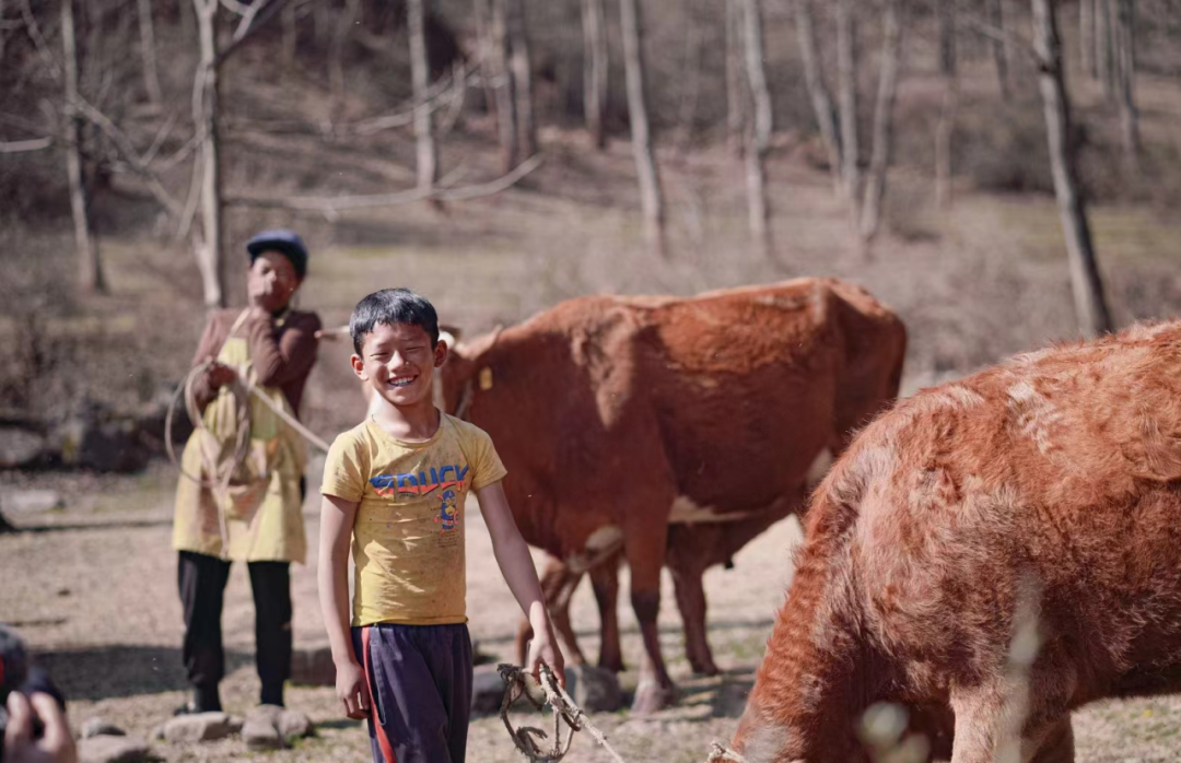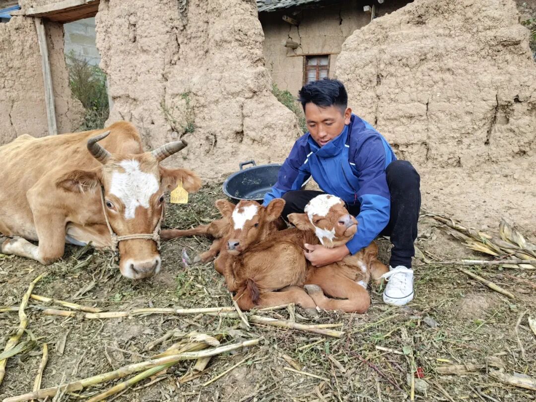 天蓝得一尘不染,远处是连绵不绝的大山,阿扭正背着山上捡的柴火回来,码好柴火后,剁了些饲草给牛吃,小孩子们在门口追打着玩闹。阿扭坐在门口,望着牛舍里的6头牛,思绪不禁飘回到过去。以前,家里只有一头老牛,阿扭和妻子又患有慢性病,无法外出打工,加上他们的几个孩子,阿扭的家庭经济沉重。