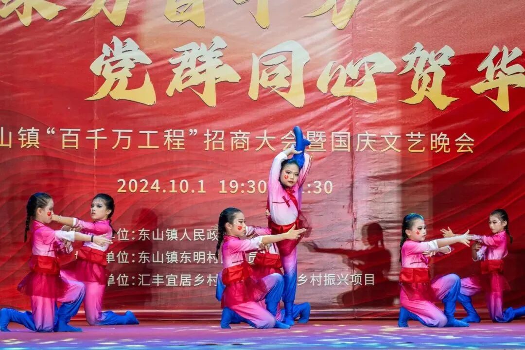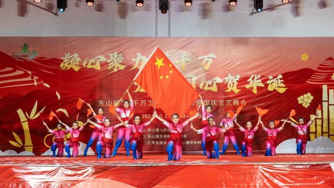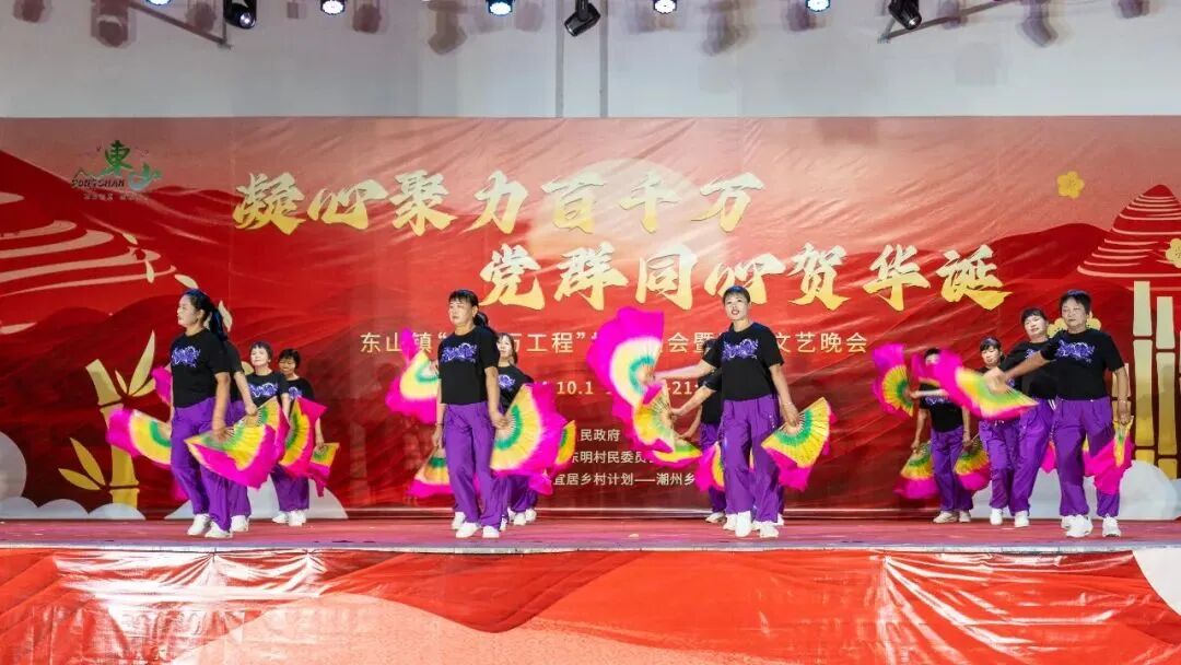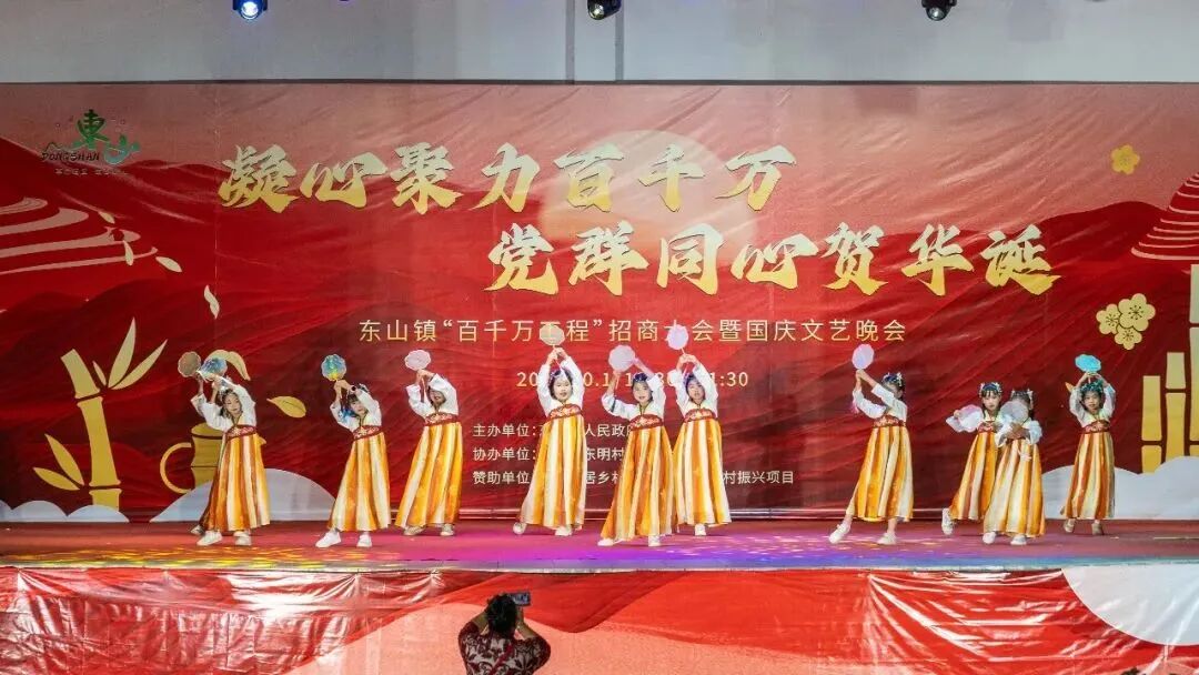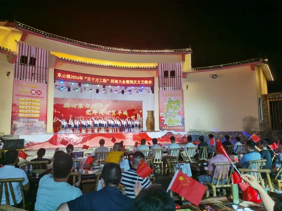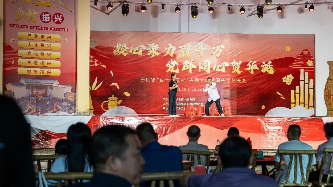 这个国庆节,饶平县               东山镇“百千万工程”招商大会暨国庆文艺晚会              在东明村隆重举行,为广大群众献上一场精彩纷呈的文化盛宴,并以此为契机宣传推介东山,展示“百千万工程”工作成果。东山镇领导班子成员、各村党组织书记、在外乡贤及社会各界人士等齐聚一堂,共话桑梓,同贺华诞。