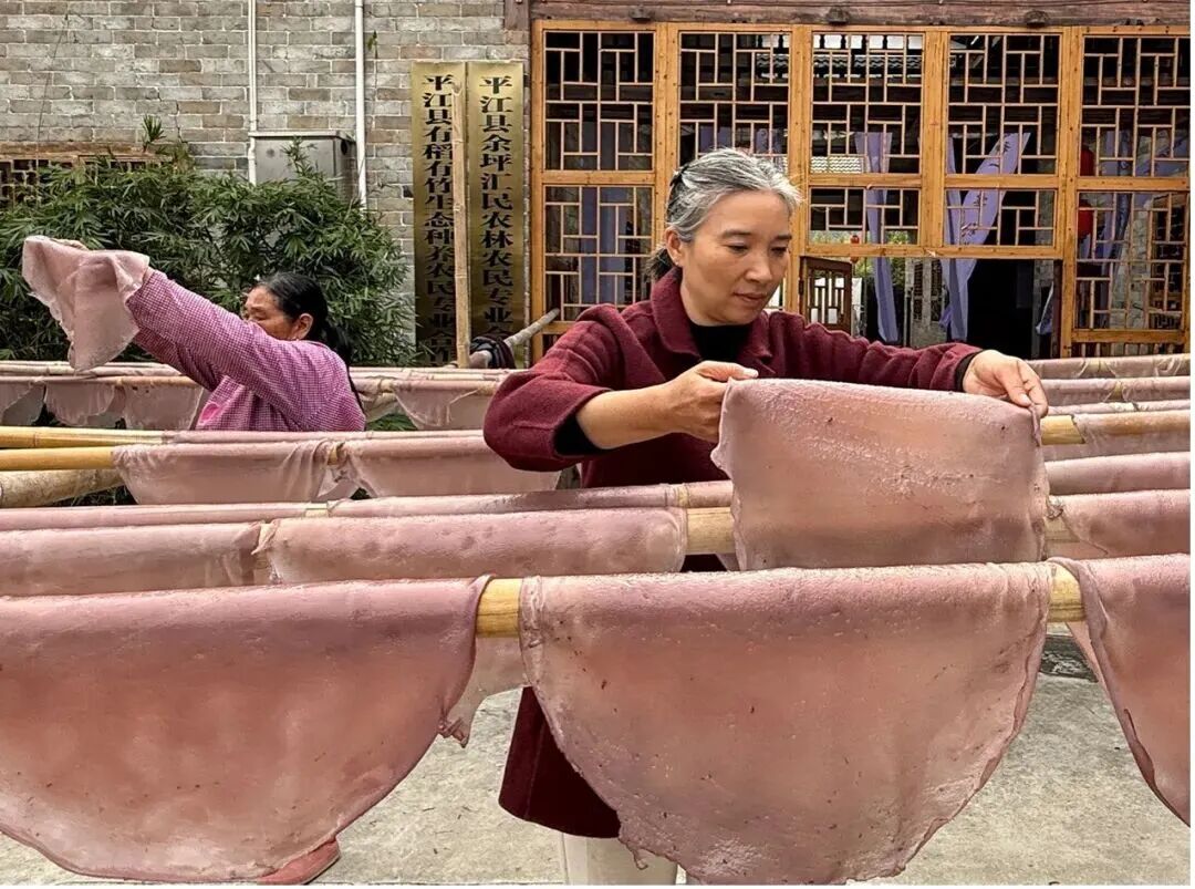 在紫薯馆边的空地上,一位农民抡着斧头奋力劈柴。在他旁边,五六位中年妇女将刚蒸出的紫薯粉皮搭在竹竿上,在阳光下晾晒。