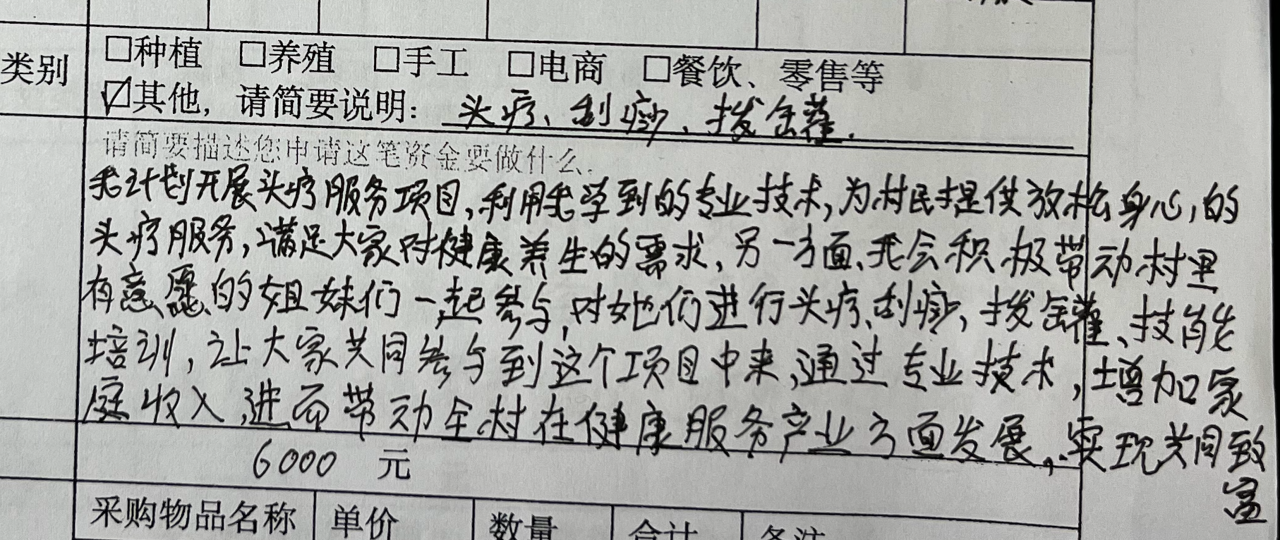 孟大姐还在申请中写道“我会积极带动村里有意愿的姐妹一起参与,对她们进行头疗、刮痧、拔罐技能培训……增加家庭收入。”